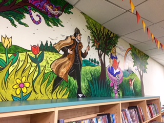 I’ve started this week on a huge mural for the Children’s section of Morden Library at the Civic Centre. The 15 metre long wall mural will feature some of my own painted versions of cult characters such as Sherlock Holmes, Alice in Wonderland and animals characters from Babe. It will be themed as a mystical forest complete with a castle, rivers and characters hidden amongst the trees. So far there’s even a tiny pt of gold to be spotted at the end of the rainbow! It should be complete by the end of April 2018.