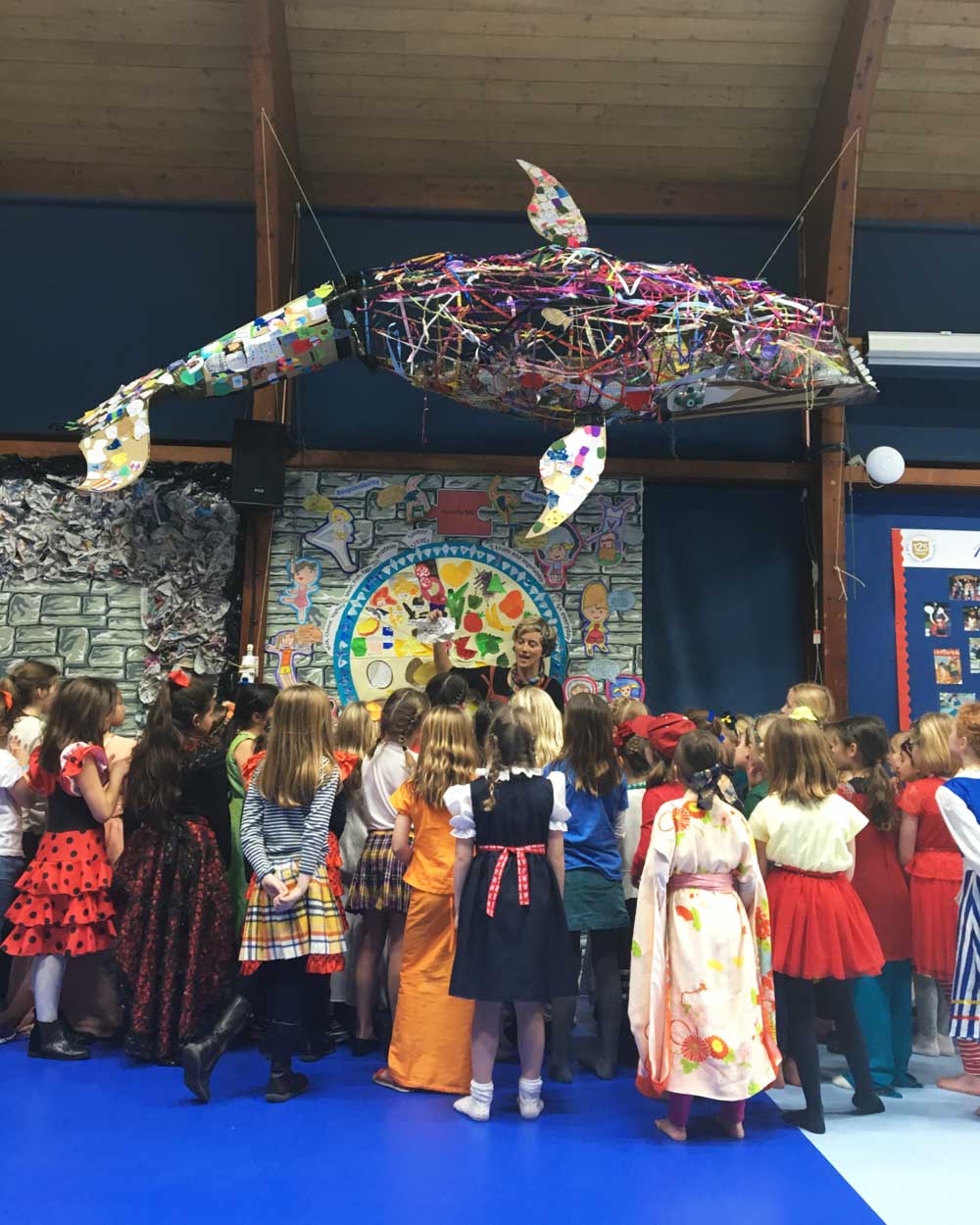 I have also been doing a few primary school workshops. One to create a giant whale from recycled materials and another to paint a huge mural reflecting the pupils drawings about their cultures.