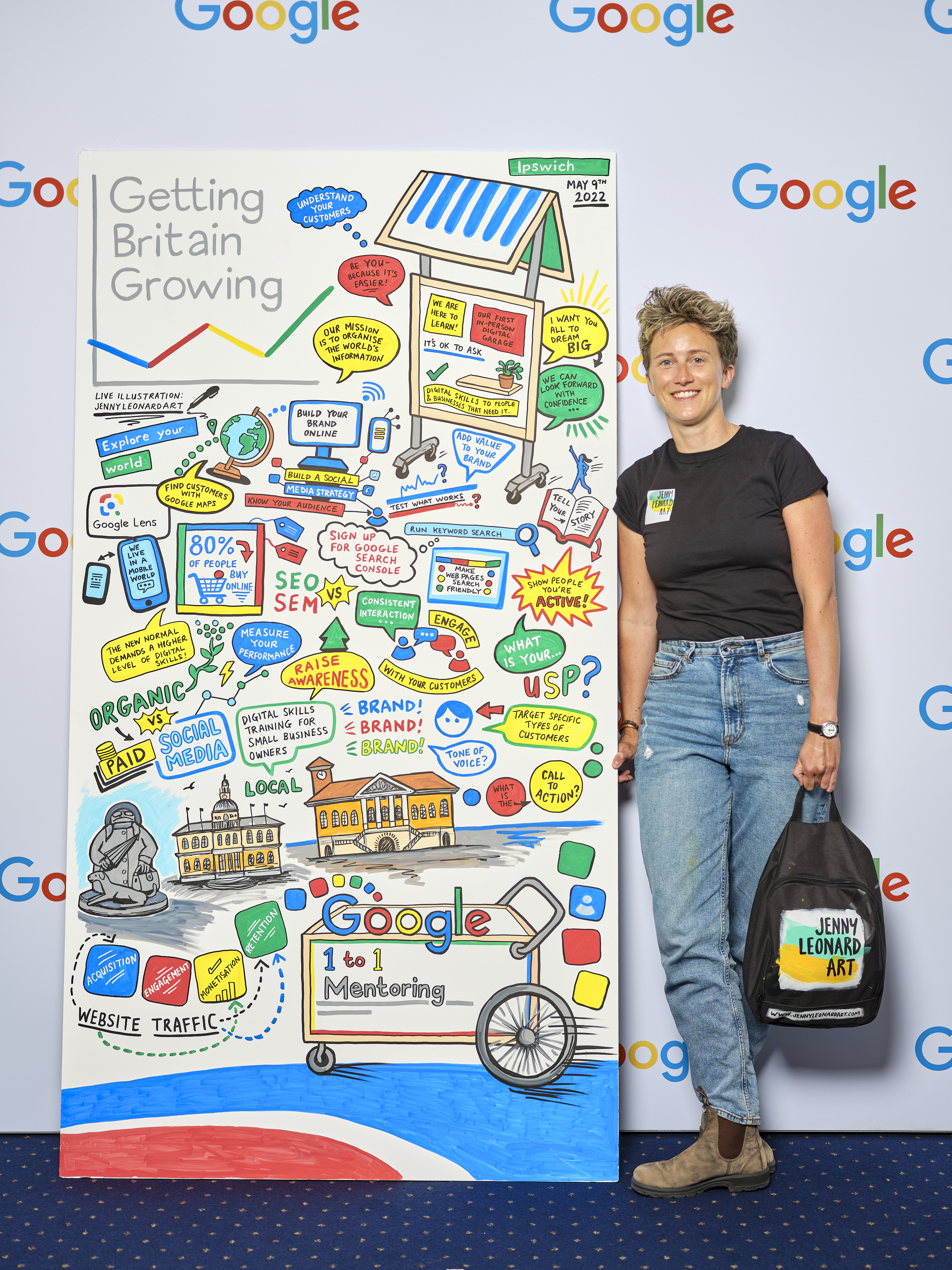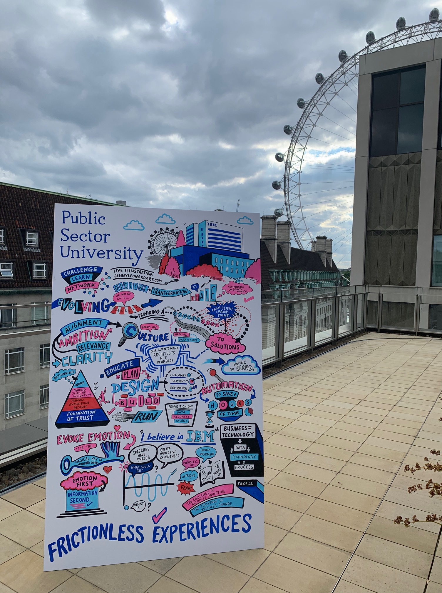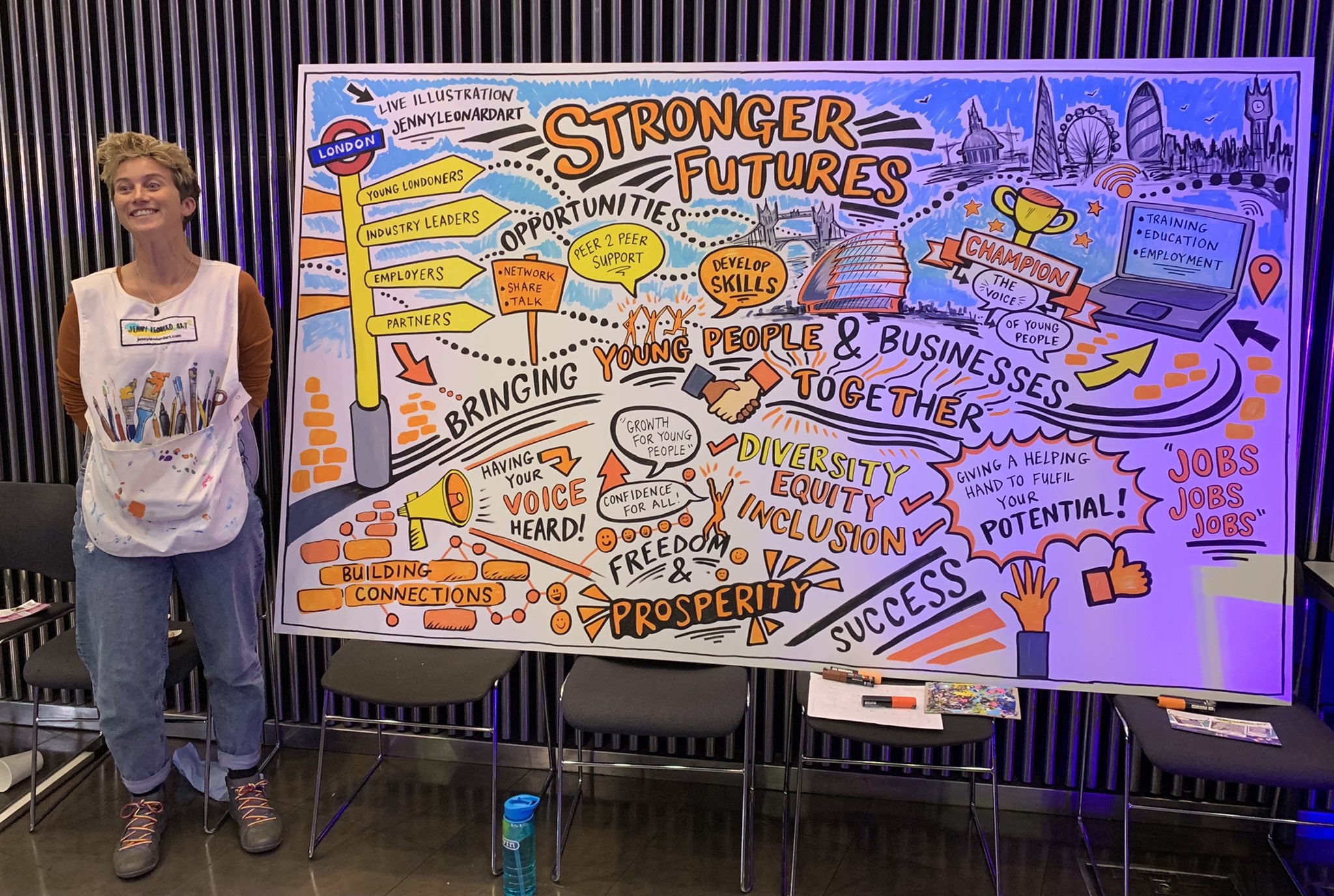 I offer in-person, virtual, and hybrid live scribing services for corporate events, conferences, team meetings, and brand activations across the UK and beyond. I have worked with top brands like Google, TikTok, BP, Oracle, and Westminster Council, I create high-energy illustrative visuals that include quotes, motifs, images and keynote speakers – tailored to your brand and event. You’ll receive a high-resolution JPEG version of the artwork after your event, perfect for use in presentations, reports, or social media.